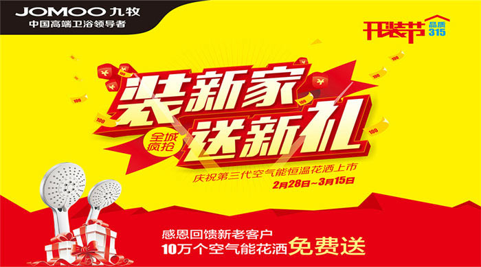 感恩回馈,十万花洒免费送九牧作为中国高端卫浴领导者,25年来创新研发厨卫健康产品,以提供健康厨卫生活为已任;同时“知恩、感恩”,在企业发展中,爱与责任同行,积极投 身社会公益活动。如:向西南干旱地区希望小学捐献10口水窖,为全国中小学免费更换铸铁水龙头,向舟曲50名贫困生捐赠爱心物资,为地震灾区雅安捐献出大 量卫浴产品等。