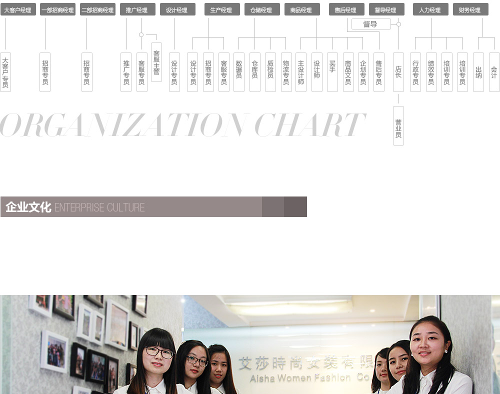 公司全权代理“香港艾上乐品(国际)时尚女装有限公司”旗下的知名时尚女装品牌"艾上乐品LGTaste"在中国大陆地区的总运营,公司通过与香港总部的精诚
